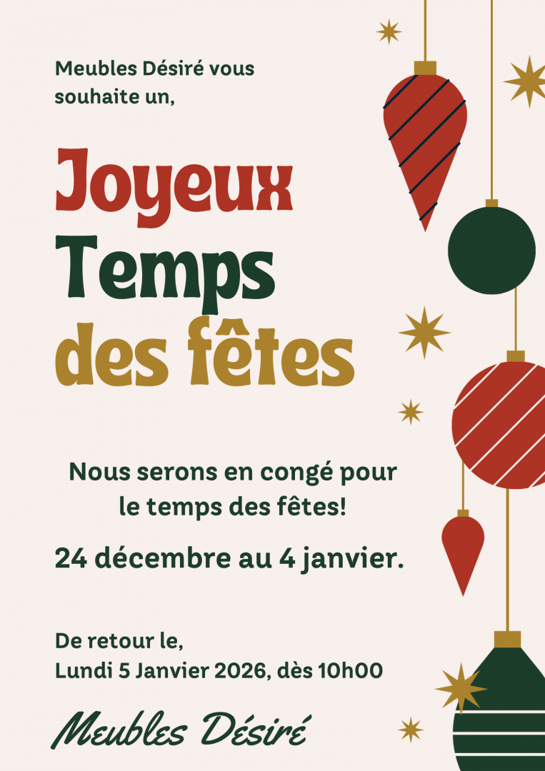 Entreprise familiale installée à Trois-Rivières depuis 1951, Meubles Désiré vous accompagne dans l’aménagement de votre intérieur avec style et durabilité. Explorez un univers où chaque meuble reflète le savoir-faire et la qualité.